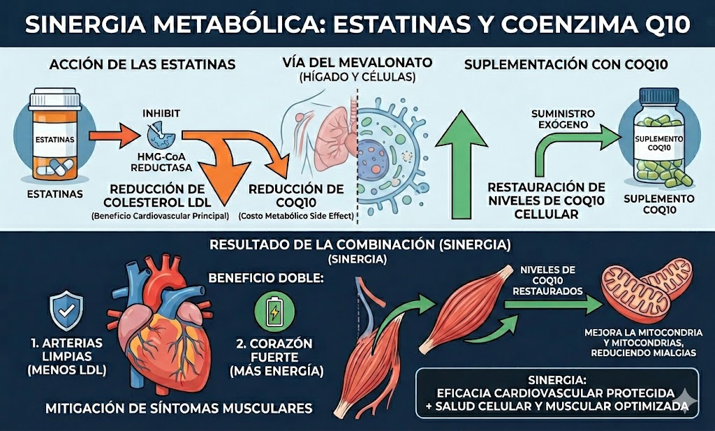El uso conjunto permite obtener los beneficios protectores de la estatina mientras se compensa el «coste» metabólico de la medicación, siendo especialmente útil para personas activas o con altas demandas físicas.